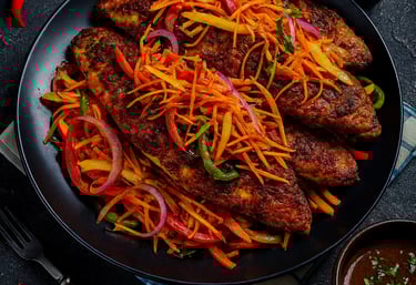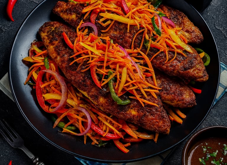 Crispy fried fish topped with tangy pickled peppers and onions. Half pan serves up to 8.
